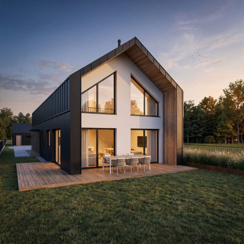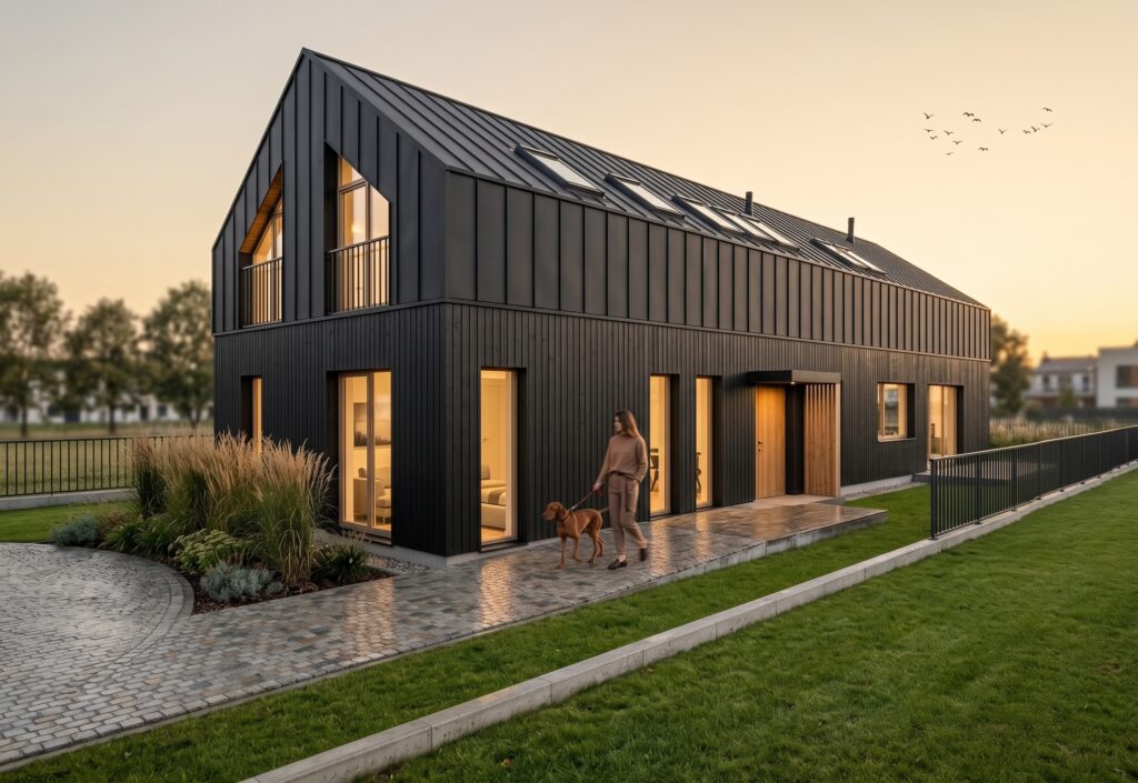 Do dyspozycji mieliśmy wąską 15 m, ale za to bardzo długą działkę. Inwestorzy mieli już na początku jasno określone upodobania co do stylistyki – minimalistyczna forma i czarna elewacje przechodząca w bezokapowy dach. Pokrycie dachowe z blachy w kolorze antracyt układanej na rąbek, która chodzi na elewację do poziomu stropu nad parterem. Na elewacji parteru zaplanowaliśmy tynk w kolorze antracyt, ale dobrze sprawdziłaby się również elewacja z wąskich desek z opalanego drewna tak jak na wizualizacji. Całość ocieplają elementy w kolorze naturalnego drewna tj. stolarka okienna, drzwi wejściowe czy lamele podpierające daszek nad wejściem. Większość okien zaprojektowaliśmy do podłogi jako porte-fenetre, z wyjątkiem okna w kuchni, przy którym znajduje się blat roboczy.