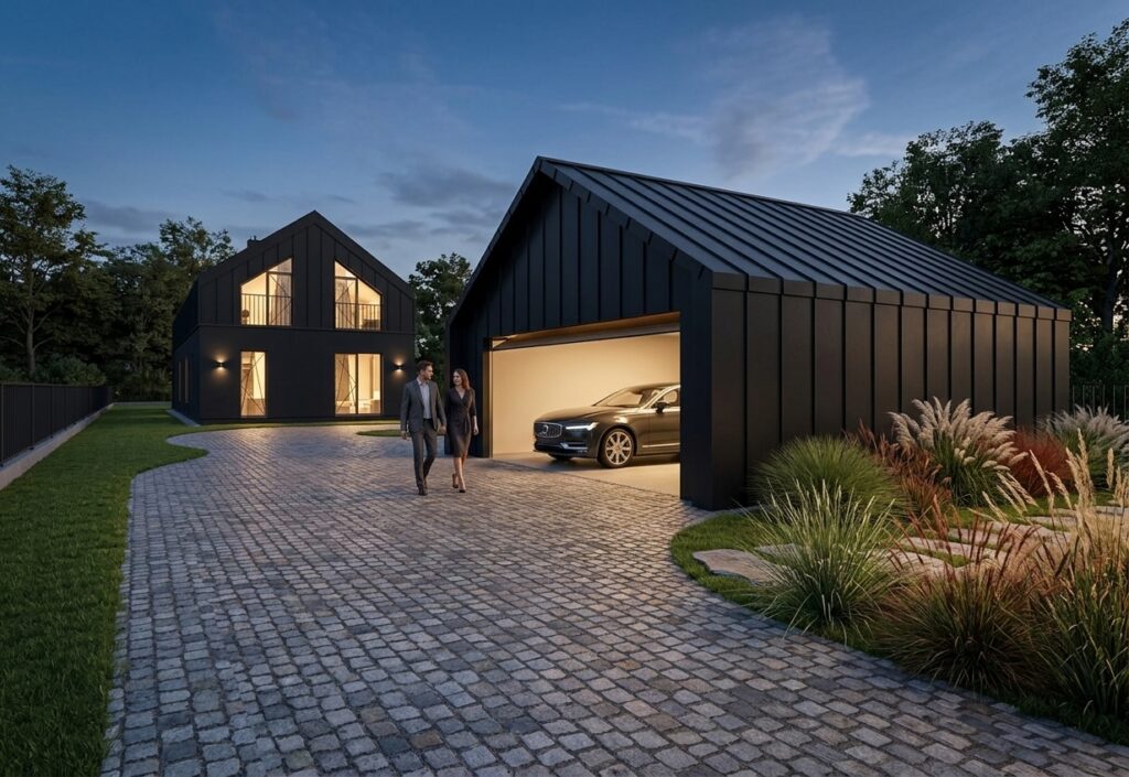 Od strony wjazdu na pierwszym planie znajduje się garaż na dwa samochody, przesłaniający delikatnie bryłę domu. Jego architektura nawiązuje bezpośrednio do stylistyki budynku mieszkalnego.