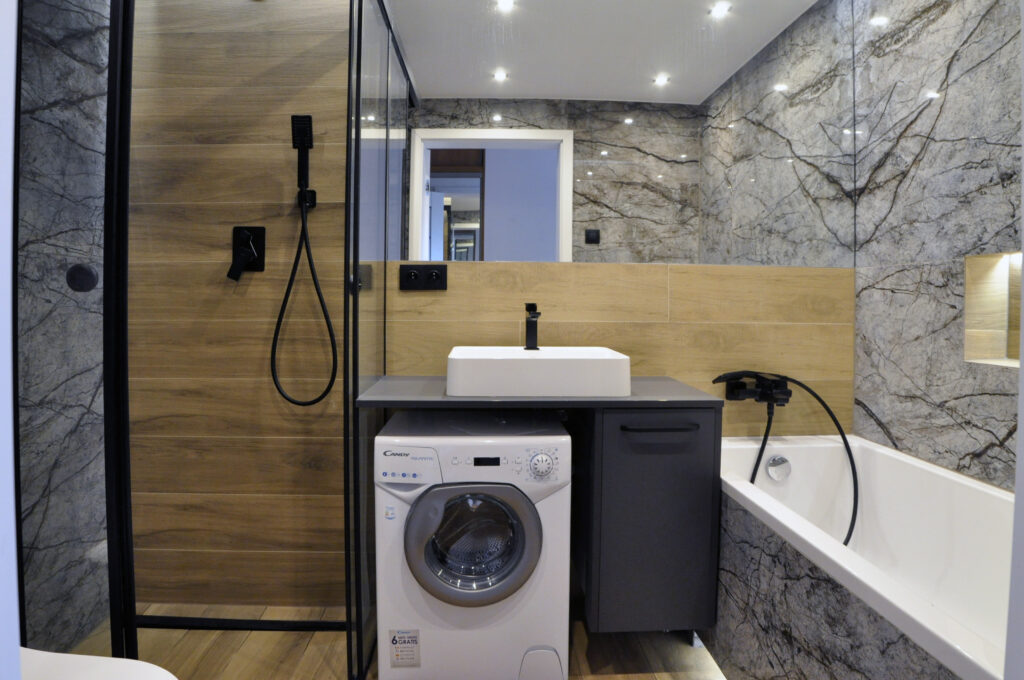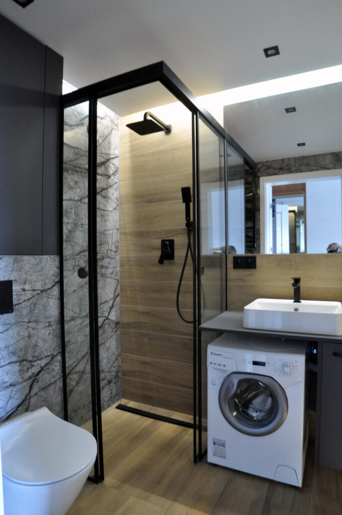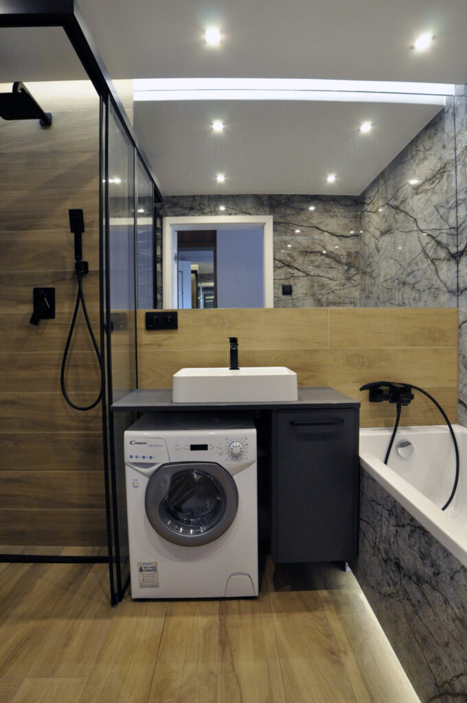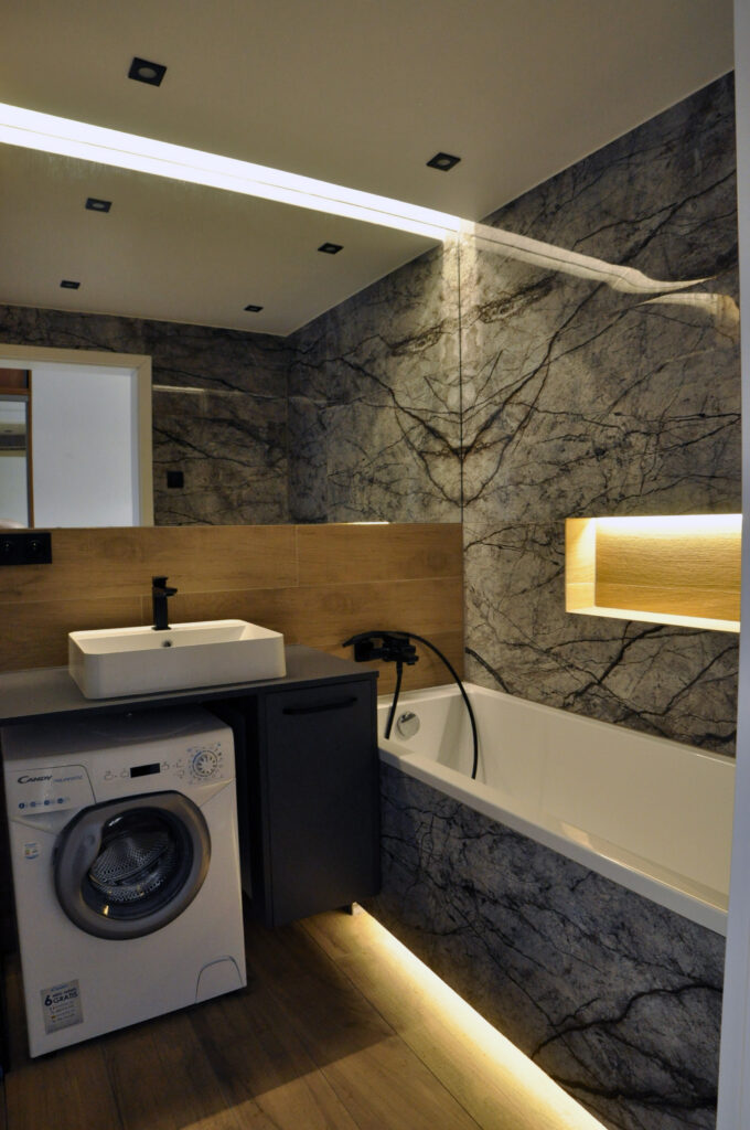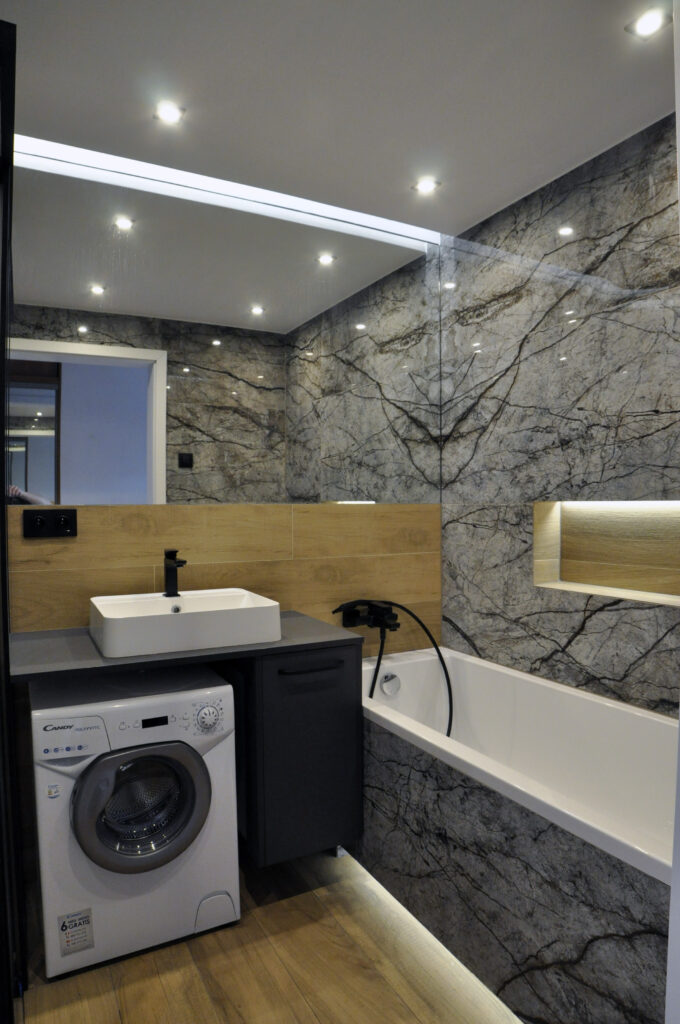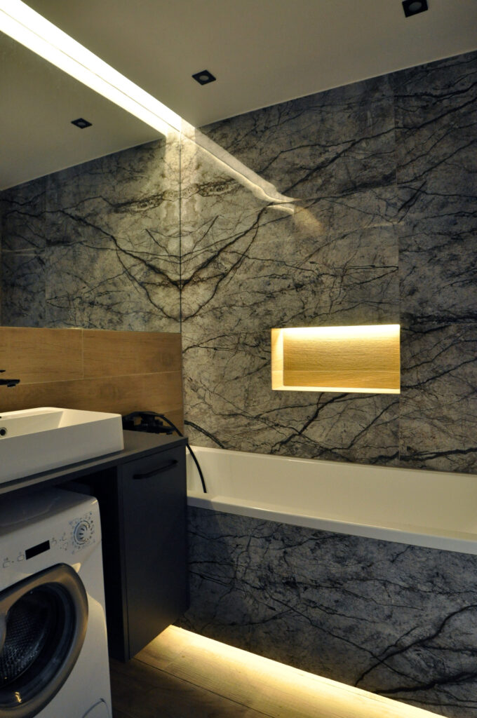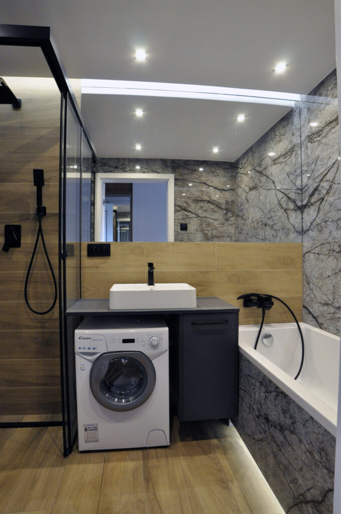 Łazienka zaprojektowana dla singla. Szukaliśmy czegoś mocnego i wyrazistego, z efektem WOW. Wybór padł na dość ciemne płytki z rysunkiem kamienia, czarne detale i listwy LED, które robią dobry klimat. Całość została ocieplona drewnopodobnym gresem. Na niewielkiej przestrzeni udało się zaprojektować wannę, prysznic z odpływem liniowym i wygodnymi półkami na kosmetyki, miskę wc ze stelażem oraz kombinację niskiej pralki, blatu, umywalki i kosza na pranie na wprost wejścia. Nad zabudowanym stelażem wc znajduje się zamykana szafka a od strony prysznica wnęka ze szklanymi półeczkami na kosmetyki, niewidoczna ze środka łazienki. Całość dopełnia wielkie lustro klejone do ściany, dzięki któremu w łazience ujawniła się twarz ducha! Nad wanną znajduje się podświetlana półeczka na kosmetyki, która zmieściła się w grubości istniejącej ściany. Oświetlenie podzielone zostało na kilka obwodów, by móc dowolnie nim sterować, w zależności od tego jaki klimat chcemy osiągnąć. Zgodnie z Inwestorem uważamy, że efekt WOW! został osiągnięty.