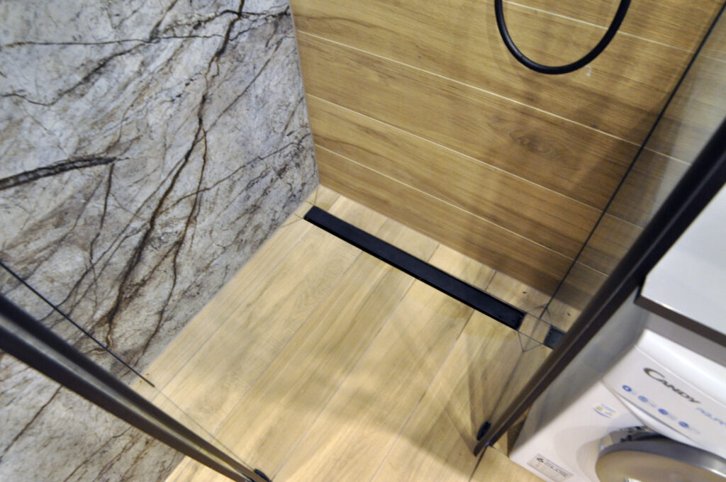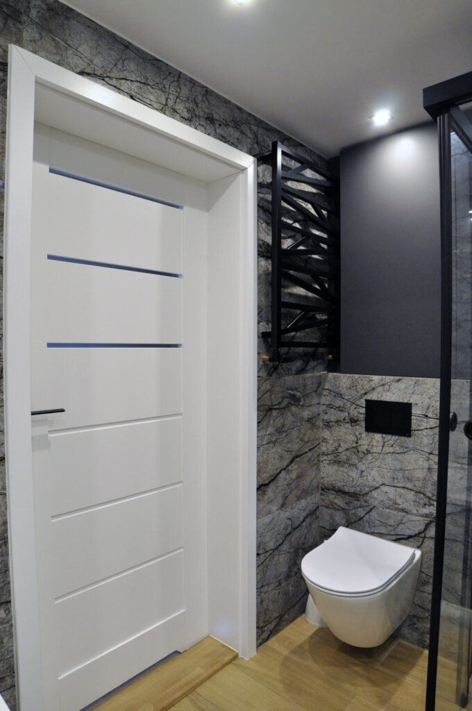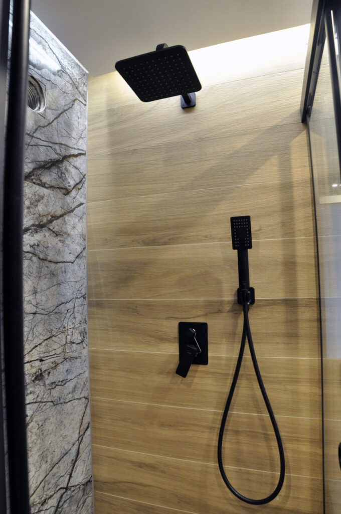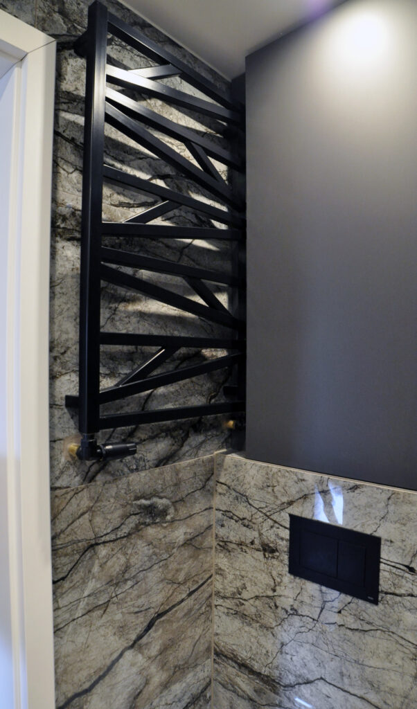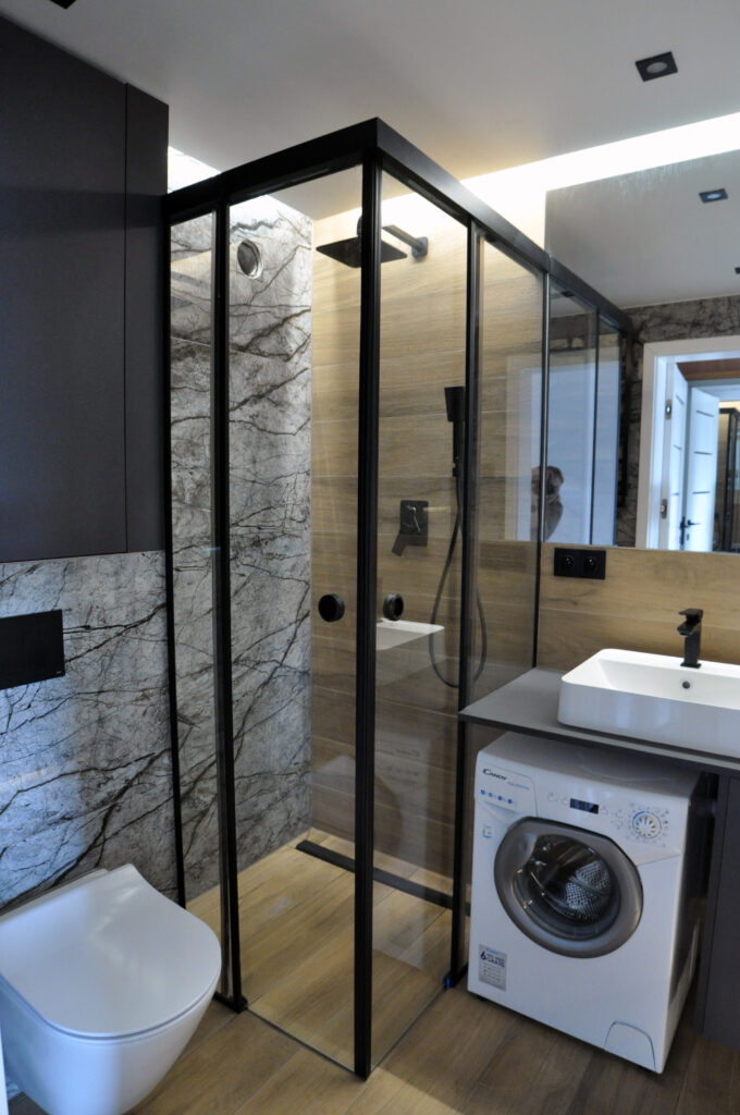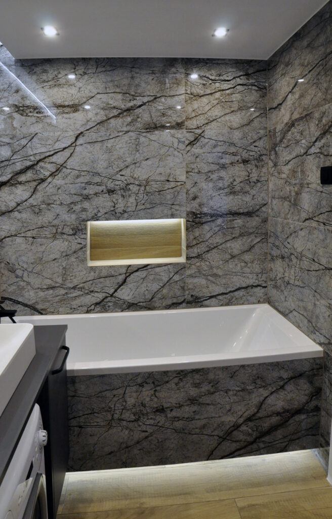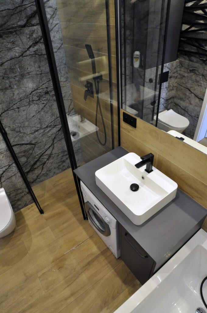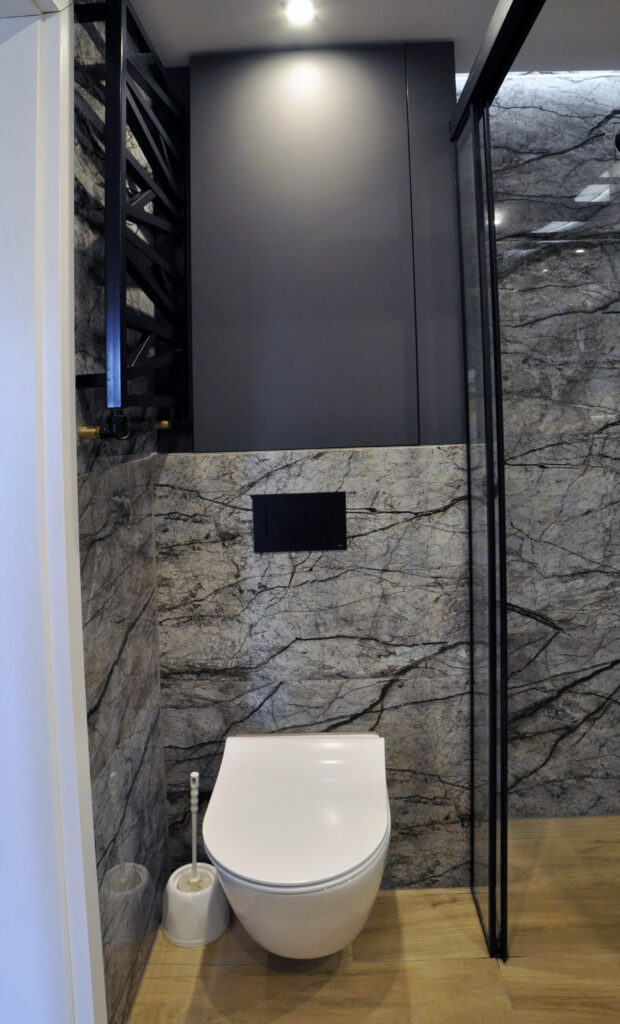 Łazienka zaprojektowana dla singla. Szukaliśmy czegoś mocnego i wyrazistego, z efektem WOW. Wybór padł na dość ciemne płytki z rysunkiem kamienia, czarne detale i listwy LED, które robią dobry klimat. Całość została ocieplona drewnopodobnym gresem. Na niewielkiej przestrzeni udało się zaprojektować wannę, prysznic z odpływem liniowym i wygodnymi półkami na kosmetyki, miskę wc ze stelażem oraz kombinację niskiej pralki, blatu, umywalki i kosza na pranie na wprost wejścia. Nad zabudowanym stelażem wc znajduje się zamykana szafka a od strony prysznica wnęka ze szklanymi półeczkami na kosmetyki, niewidoczna ze środka łazienki. Całość dopełnia wielkie lustro klejone do ściany, dzięki któremu w łazience ujawniła się twarz ducha! Nad wanną znajduje się podświetlana półeczka na kosmetyki, która zmieściła się w grubości istniejącej ściany. Oświetlenie podzielone zostało na kilka obwodów, by móc dowolnie nim sterować, w zależności od tego jaki klimat chcemy osiągnąć. Zgodnie z Inwestorem uważamy, że efekt WOW! został osiągnięty.